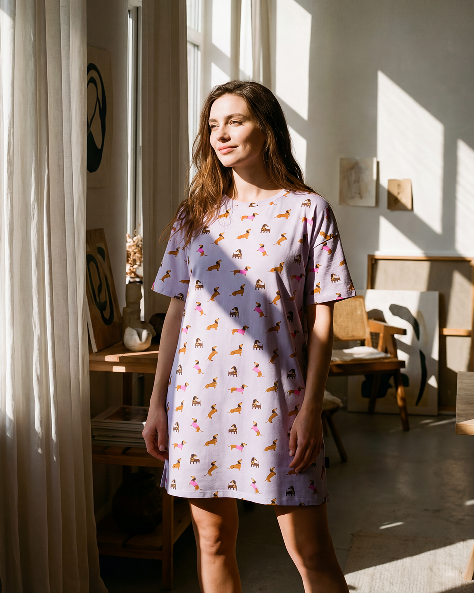 Our super comfy and playful Dash Dreaming Bamboo Jersey Night-Tee is the ultimate in relaxed sleepwear. Featuring an adorable all-over dachshund print, this night-tee is made from our signature sustainable Bamboo/Cotton blend stretch jersey, making it luxuriously soft, breathable and perfect for a restful night’s sleep.